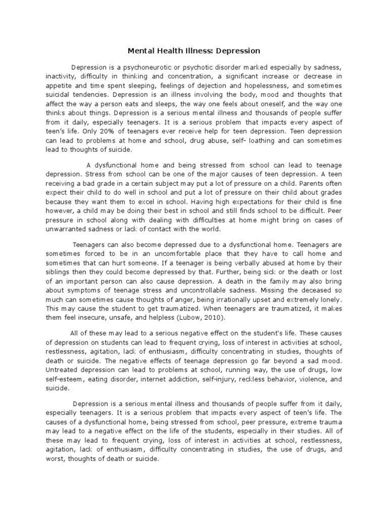 · According to the Mayo Clinic Depression, also known as major depressive disorder is a mood disorder that causes a feeling of sadness and a loss of interest. Depression can cause physical problems because it affects how you think along with how you act. For example, you may not want to do activities that you normally would, due to this disorder words | 4 Pages. Introduction Depression is an illness that can affect all aspects of daily life because of its negative impact on thoughts, emotions, energy level, and the focus of this paper, working memory. Depression can have many causes, including the stress generated by a demanding job and · Depression According to the DSM-VI, the symptoms of depression fall into four different categories: cognitive (feelings of low self-worth or unbecoming guilt), physical (forms of insomnia or loss of appetite), emotional (enormous sorrowful feelings), and motivational (lack of motivation and aspiration)